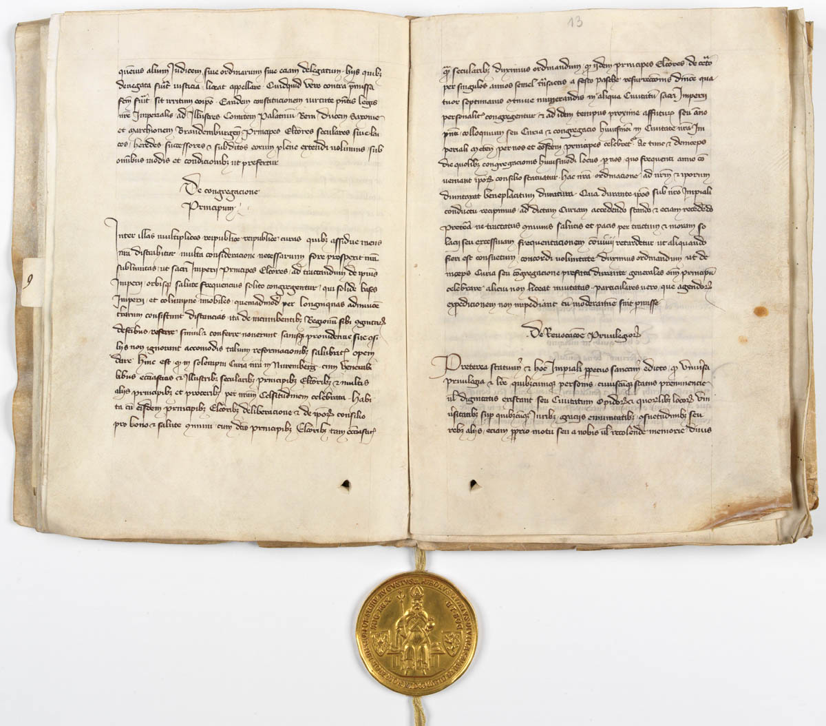 Die Goldene Bulle Kaiser Karl IV. (1316-78) erließ 1356 ein Gesetz, das er selbst unser keiserliches rechtbuch nannte. Erst ca. ein halbes Jahrhundert später setzte sich unter Ruprecht von der Pfalz (reg. 1400 – 1410) die Bezeichnung Goldene Bulle durch.