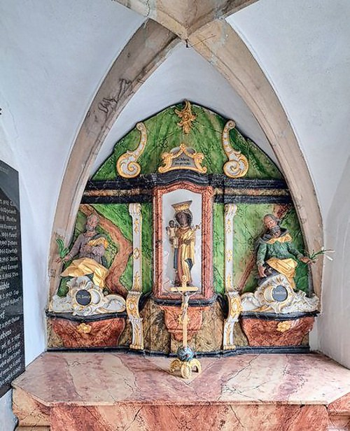 Seitenaltar ist der hl. Barbara, Patronin der Bergleute und der Sterbenden,