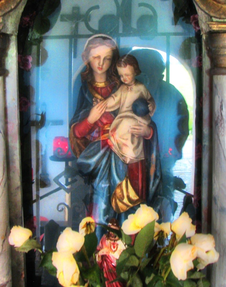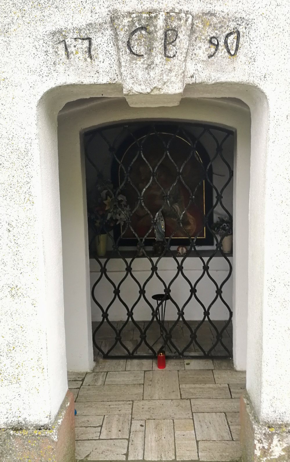 Die Inschrift über dem Eingang der Kapelle scheint mir durch Übertünchungen im Laufe der Zeit fehlerhaft geworden zu sein, z.B. könnte das Jahr der Erbauung 1796 gewesen sein. Das Gitter vor dem Gnadenbild soll dieses schützen. Diebe haben vor einigen Jahren auch das Glöcklein gestohlen, das an einer der Steinsäulen angebracht war.