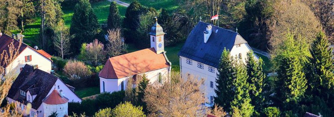Neben dem Schloss steht auch die kleine Kirche St. Philippus und St. Jakobus (hier in der Mitte), über die der jeweilige Schlossbesitzer seit 1576 auch Patronatsherr war. Weil die Kapelle außerhalb der Mauern steht, haben die Schlossbewohner Zugang durch ein kleines Türchen in der Nähe des Kapelleneingangs, das mit einer Metalltüre gesichert ist. Links am Bildrand das ehemalige Schulhaus von Artelshofen. (Drohnenbild) über dem Eingang der Kapelle das Wappen der Tetzel Die Schlosskapelle