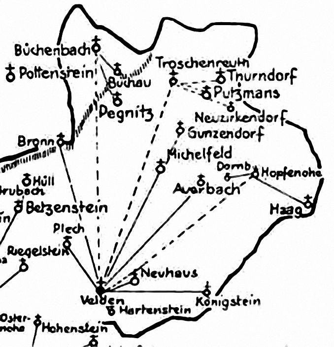In den folgenden Jahrhunderten wurden von dieser Urpfarrei Velden aus zahlreiche Tochterkirchen in den nordöstlich und nordwestlich gelegenen Gebieten gegründet, z.B. 1121 Michelfeld, 1144 Auerbach, 1476 Neuhaus, 1480 Königstein und 1662 Hartenstein.