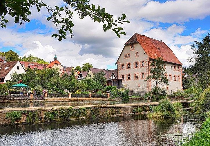 Eingemeindungen hat die gesamte Stadt heute mehr Einwohner. "Velden (Veldtuna – zu den Feldern, mitten im Waldgebiet) ist als Forsthof inmitten großer Waldgebiete entstanden und der urkundlich am frühesten erwähnte Ort des gesamten östlichen Nürnberger Umlandes. Am 1. Mai 889 stellte Kaiser Arnulf von Kärnten zu Velden am Pegnitzflusse eine Urkunde aus, wodurch er seinem Vasallen Perchtolf fünf Huben zu Farchhausen und Gotteshausen verlieh." (Quelle) "Am 19. April 1945 wurden bei einem Luftangriff 53 Wohnhäuser sowie zahlreiche Scheunen, Stall- und Nebengebäude zerstört. In den erhalten gebliebenen Wohnungen mussten nicht nur die obdachlos gewordenen Veldener, sondern darüber hinaus 250 Flüchtlinge und etwa 150 Evakuierte aus Nürnberg aufgenommen werden." (Quelle) Eine der zahlreichen Sehenswürdigkeiten der Stadt Velden ist die Marienkirche.