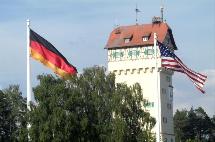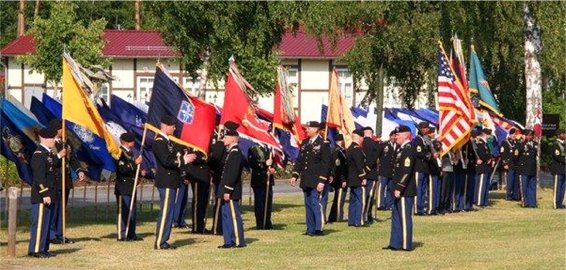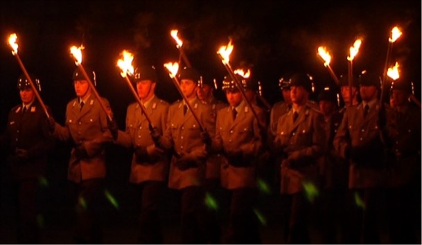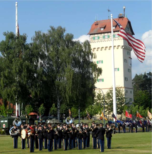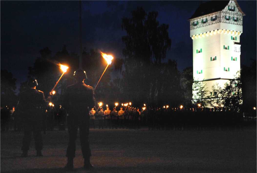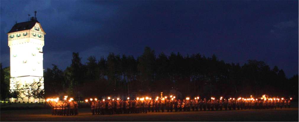 Vor der prächtigen Kulisse des angestrahlten Wasserturms zogen im Fackelschein die teilnehmenden Soldaten ein. Unter den Klängen des Gebirgs-Musikkorps aus Garmisch-Partenkirchen unter Leitung von Hauptmann Christian Prchal nahmen die Soldaten des Logistikbataillons 472 Kümmersbruck unter Leitung von Oberstleutnant Georg Schreglmann ihre Position ein. (nachfolg. Foto aus 5) Die genau festgelegte traditionelle Musikfolge "Großer Zapfenstreich" wurde gekonnt vom Musikkorps gespielt. Auf dem Podium nahmen von militärischer Seite die US-Generäle Ham und Salazar, der Befehlshaber des Wehrbereichs IV, General Wessels, sowie von ziviler Seite Regierungspräsidentin Brunner und 1. Bürgermeister Wächter (Grafenwöhr) die Parade ab. Dazu kamen noch ein paar Tausend amerikanische und deutsche Besucher, die in den Zelten, auf den Tribünen und drum herum Platz gefunden hatten. (nachfolg. Foto aus 5) Es war eine beeindruckende Feier zum 100. Geburtstag des Truppenübungsplatzes Grafenwöhr. Die von allen Rednerinnen und Rednern angesprochene deutsch-amerikanische Freundschaft wurde durch die Zeremonien sicher gefestigt - für die nächsten 100 Jahre. verwendete Quellen