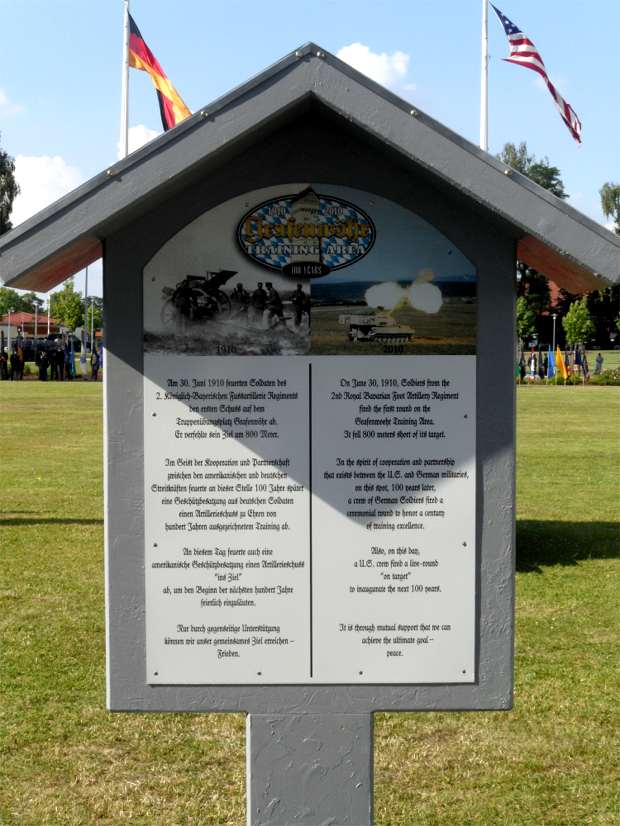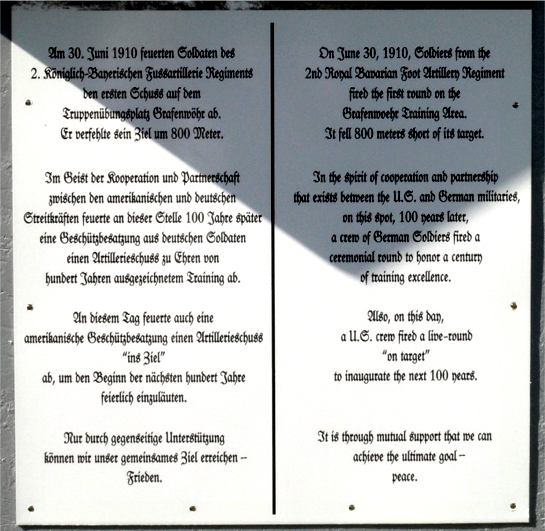 Diese Gedenktafel am Paradeplatz des Truppenübungsplatzes erinnert an das gemeinsame "Jubiläumsschießen". Die Inschrift schließt mit: "Nur durch gegenseitige Unterstützung können wir unser gemeinsames Ziel erreichen - Frieden." Am späten Nachmittag war der Truppenübungsplatz für die Bevölkerung "offen". Auf dem Paradeplatz war im Beisein zahlreicher Ehrengäste und sehr vieler "normaler Besucher" eine feierliche Zeremonie zum 100. Geburtstag.