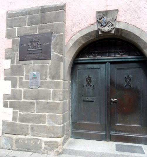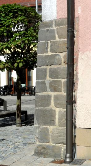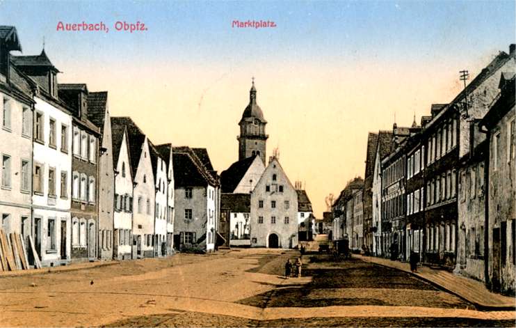 Ein kleines Rätsel scheinen die an der Südseite des westlichen Teiles des Rathauses zu sehenden gemauerten Ecken zu sein. Stammen sie noch aus der Bauphase des 16. Jahrhunderts, oder wurden sie erst Mitte des 19. Jahrhunderts quasi als Stützen angebracht? Eine Befunduntersuchung könnte das wohl klären. Das Auerbacher Rathaus erhielt mit dem Abbruch des Außenaufganges 1838/39 praktisch sein heutiges äußeres Aussehen. Das unseren Vorfahren über Jahrhunderte vertraute obige Bild des Auerbacher Rathauses mit den Zinnengiebeln und der Außentreppe verschwand allerdings für immer. Dieses alte Foto um 1900 (Archiv Josef Zimmermann, Welluck) zeigt das Rathaus vom Unteren Markt her gesehen. Die Zinnengiebel waren 1839 nicht mehr angebracht worden, der Dachreiter, von dem aus ein Glöcklein über Jahrhunderte die Ratsherrn zu den Sitzungen gerufen hatte, wurde 1869 abgebrochen. Bei der großen Renovierung 1929 wurde das Türmchen dann wieder aufgesetzt. |