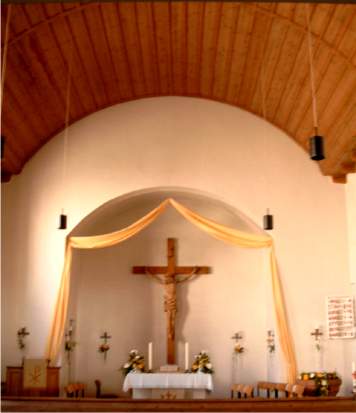 neue Kirche Auerbach Opf. (hj) Mit der neuen evangelischen Kirche, die am morgigen Sonntag eingeweiht wird, hat Auerbach zugleich ein Gebäude erhalten, das sich ausgezeichnet ins Stadtbild einfügt, und besonders der Bahnhofstraße zur Zierde gereicht. Im spitzgiebelig hohen Ziegeldach und im Bruchsteinsockel sind landschaftsgebundene Stilelemente zum Ausdruck gekommen. Der reichliche Bauplatz und der Abstand des Frontgiebels zur Straße geben dem Bau eine vorteilhafte Gesamtwirkung. Da das Gebäude, den Erfordernissen einer kleinen Gemeinde entsprechend, nicht nur Kirche sein, sondern zugleich Amts- und Wohnräume sowie einen Jugendsaal enthalten sollte, ergab sich für den Architekten, Regierungsbaumeister Eberhard Braun, Neuendettelsau, eine komplizierte Aufgabe, die geschickt gelöst wurde. Der von der Straße abgelegene Teil des Baues enthält Amts- und Wohnräume für den Pfarrer. Der Jugendraum hingegen liegt an der Frontseite der Kirche, unterhalb der Empore, und kann mittels völlig zusammenlegbarer Türen zu einem Teil des Kirchenraumes gemacht werden. Das an sich betont schlichte Innere der Kirche wird vor allem durch zwei Bauelemente architektonisch reizvoll: die tonnengewölbte Holzdecke und den durch Säulen vom Schiff getrennten Seitengang längs der Westmauer, durch den der Eintretende, von der ebenfalls sehr gelungenen Eingangs-Vorhalle her, zum Gestühl gelangt. Auf der Altar-Plattform stehen Kanzel und Taufstein; beide sind transportabel, so daß die Plattform auch für religiöse Theateraufführungen verwendet werden kann.