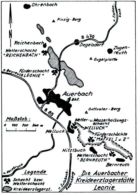 Auf dieser Planzeichnung (aus 4, Seite 546) stellt Dr. Pfeufer die Situation der Lagerstätten im Raume Auerbach dar. Dazu ist u.a. anzumerken, dass mit B 470 die alte Trasse dieser Bundestraße gemeint ist. Heute ist sie ein Fuß- und Radweg von Auerbach in den ca. 2 km nordwestlich des Rathauses liegenden Ortsteil Degelsdorf durch das Naturschutzgebiet Grubenfelder Leonie. (BayernAtlas) Die neue Trasse wurde als Umgehungsstraße über den Pinzigberg 1976 in Betrieb genommen.