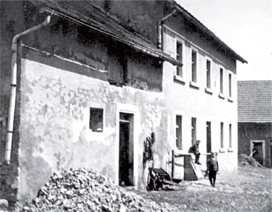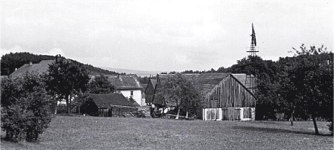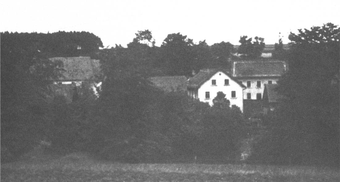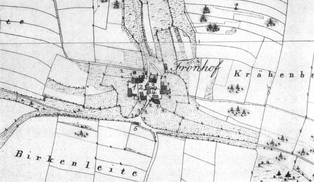 Das Hirthaus (Nr. 5) war bereits um 1920 abgerissen worden. Fronhof von Süden aus gesehen: links Nr. 2, in der Mitte mit dem Giebel nach vorn Nr. 4 und rechts Nr.3 (Foto nach 2, Seite 141) Blick vom Westen auf Fronhof: links im Hintergrund der Krähenberg (539 m), davor Nr. 1 und 2, und in der Mitte Nr. 4. Das Windrad gehörte zum Bauernmichl. (Foto nach 2, Seite 141)