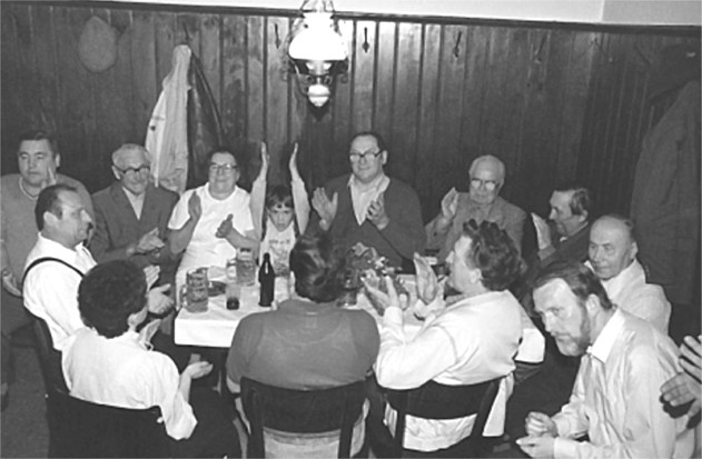 Bienerschmuckl-Abschied am 24. April 1987. Mit im Bild Baptist Luber (2. hinten links), rechts daneben Betty und Josef Luber mit Enkel Matthias dazwischen. (aus 1, Seite 219) Über mir leihweise zur