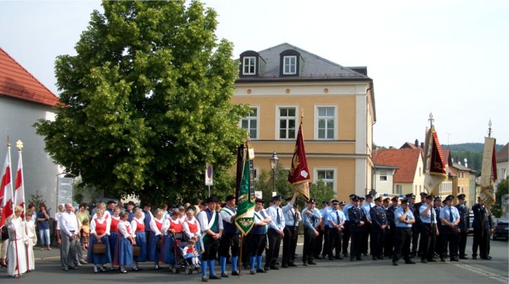 Singend und betend ziehen die Gläubigen auch heute noch durch die Straßen der Stadt Auerbach. Traditionsgemäß wird im Verlauf dieser Fronleichnamsprozession dann an vier Altären angehalten, der Anfang eines der vier Evangelien verkündet und, verbunden mit Gebeten zu besonderen Anliegen, der eucharistische Segen erteilt. Die vier Altäre werden in unseren Tagen aufgebaut an der Marienstatue beim Kolpingshaus (früheres Dr.-Merkl-Haus), bei der Marienapotheke (früher beim Burgerhaus, Unterer Markt 34), beim Caritasheim „St. Hedwig“ (früher beim Bürgerspital) und auf dem Oberen Marktplatz am Rathaus (früher vor der alten Stadtschreiberei). Die folgenden Fotos stammen von der Fronleichnamsprozession 2006.