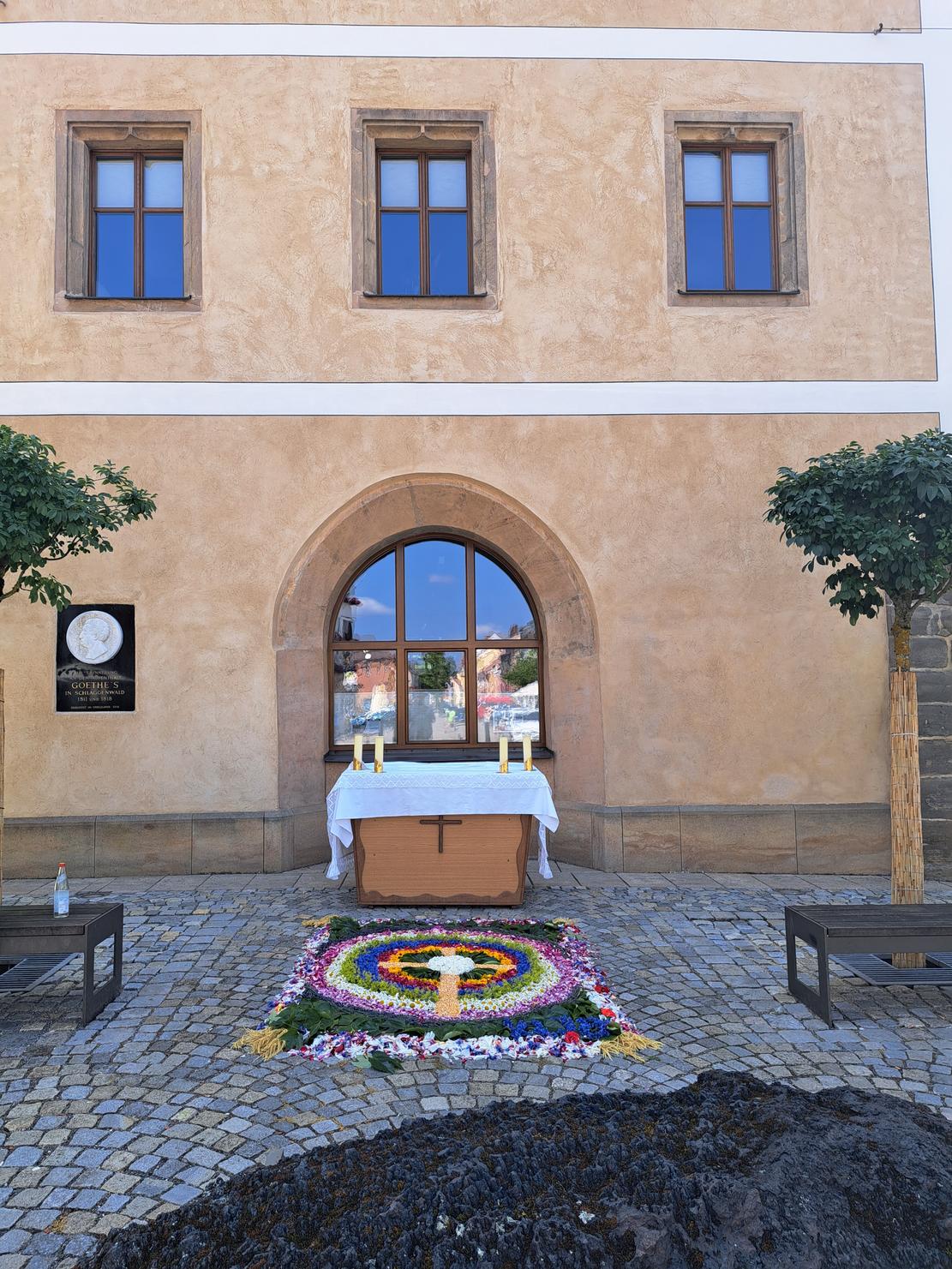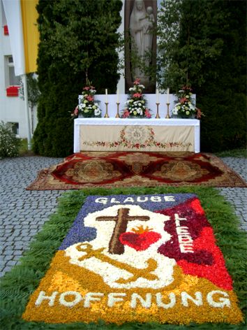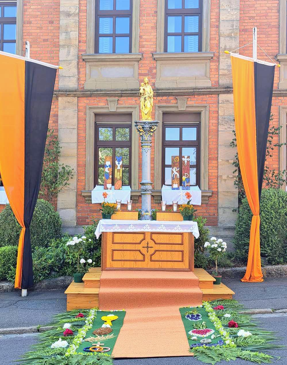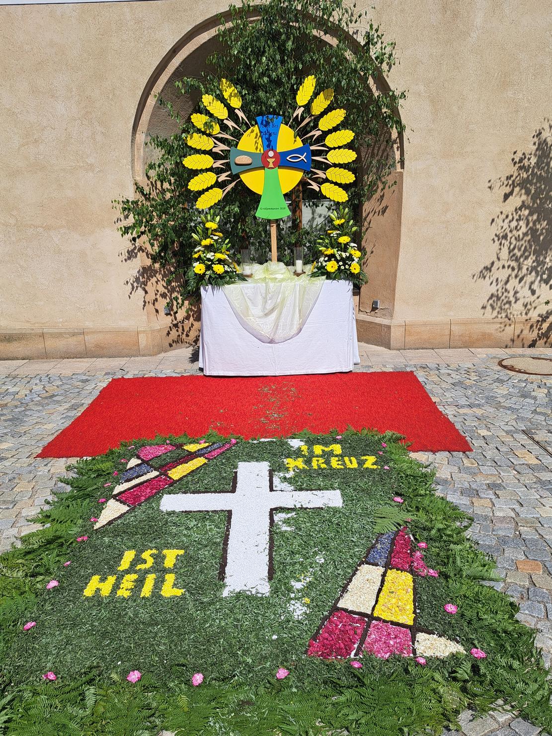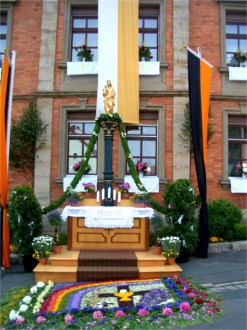 Altar und Blumenteppich gestaltete traditionell der kath. Frauenbund. Der 2. Altar war wie üblich am Kolpingshaus bei der Mariensäule, gestaltet wieder von der Kolpingfamilie.
