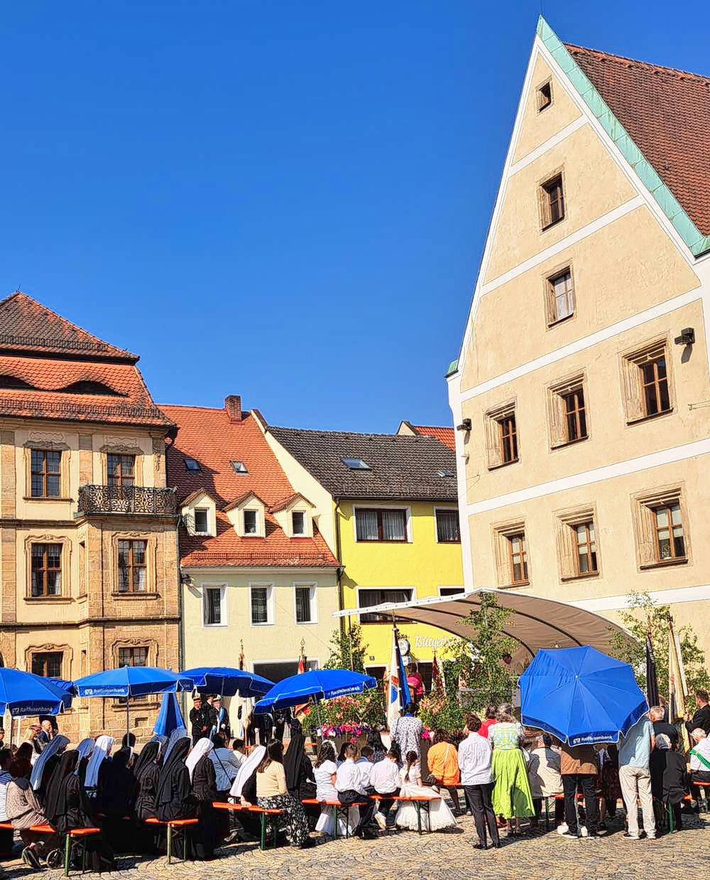 Fronleichnam 2025 (19. Juni) Aus verschiedenen Gründen verlief die Prozession heuer etwas anders als sonst. Das zeigte sich schon beim Festgottesdienst: er begann wie üblich um 8.30 Uhr, aber anders als in den Vorjahren in der Pfarrkirche St. Johannes der Täufer. Also nicht auf dem Marktplatz.