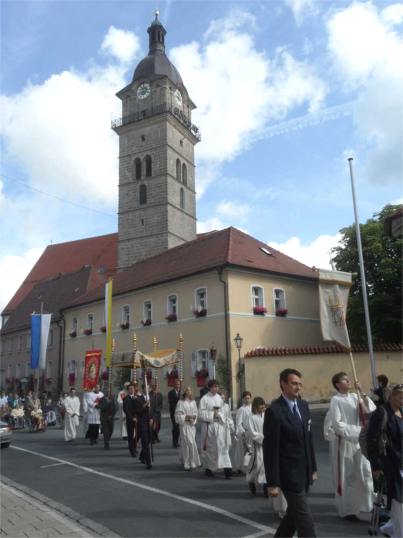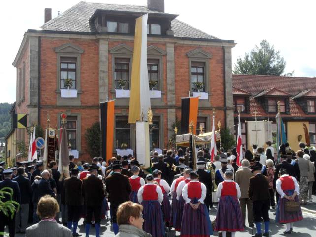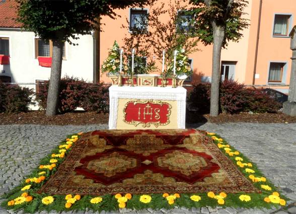 Wie jedes Jahr hatten zahlreiche Anwohner ihre am Prozessionsweg liegenden Häuser besonders geschmückt. Leider geht dieser Brauch aber immer mehr zurück. Die Prozession begann traditionell am ersten Altar beim Rathaus mit einer Messfeier.