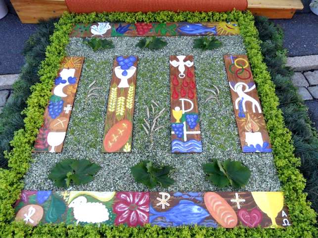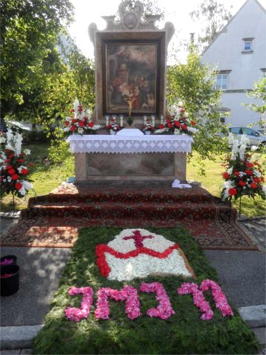 Hier hatte sich die Frauengruppe der Kolpingsfamilie etwas Besonderes einfallen lassen: Auf acht Bretter hatte Annemarie Hartmann mit Acrylfarben eucharistische Motive wie Trauben und Wein, Ähren und Brot, Fisch und Lamm usw. gemalt. Zwischen den Brettern waren Blumen und frisches Grün gestreut. Ein wahres Kunstwerk zur Ehre Gottes!