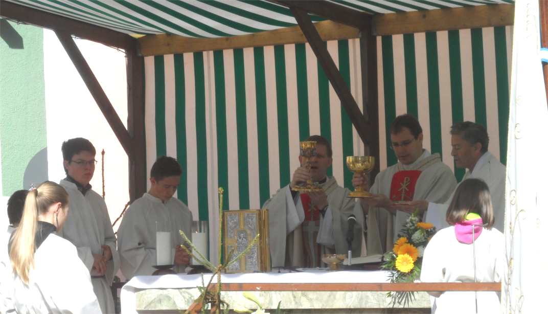 Zelebranten waren Monsignore Karl Ellmann (rechts), seit kurzem Hausgeistlicher im Mutterhaus der Schulschwestern (vorher 34 Jahre Pfarrer im oberbayerischen Teisendorf), sowie die Patres Alexander Prosche (links) und Frank Schwegler, beide CR. Pfarrer und Dekan P. Dominik war bei der Fronleichnamsprozession in Neuzirkendorf, das von ihm mit betreut wird.