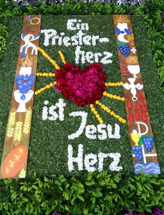 Den wunderschönen Blumenteppich (oben) hatten wieder Mitglieder der Kolpingsfamilie gelegt. Die Handschrift der langjährigen Vorsitzenden Annemarie Hartmann, besonders bei den beiden bemalten Brettern links und rechts, ist unverkennbar.