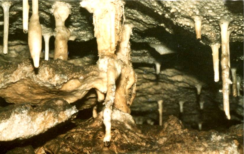 zeigen mehrere verschieden große Stalakiten. Im oberen Foto ist rechts von der