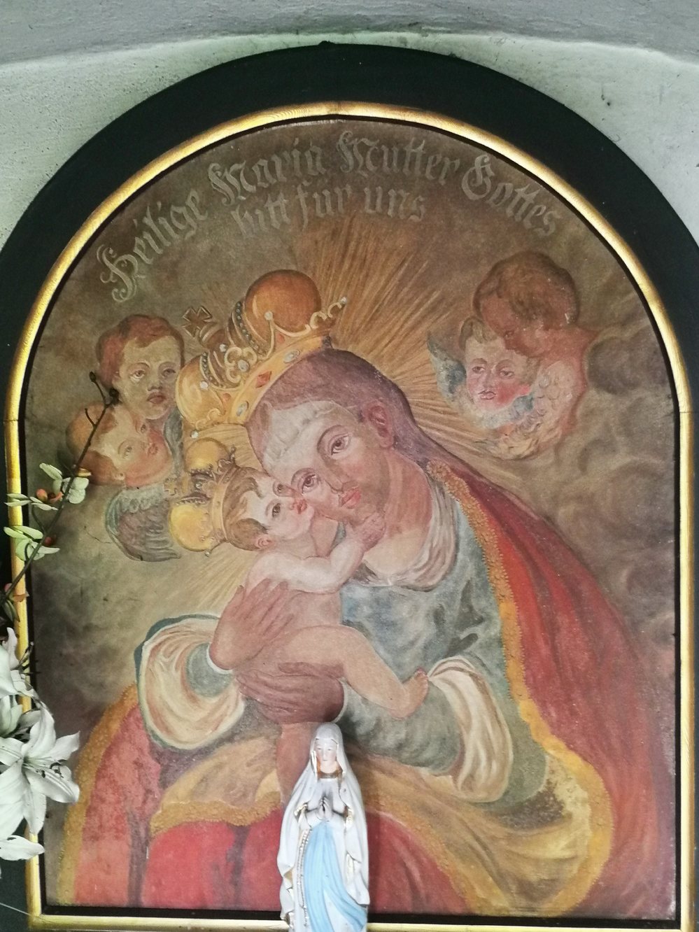 Die Inschrift über dem Eingang der Kapelle scheint mir durch Übertünchungen im Laufe der Zeit fehlerhaft geworden zu sein, z.B. könnte das Jahr der Erbauung 1796 gewesen sein. Das Gitter vor dem Gnadenbild soll dieses schützen. Diebe haben vor einigen Jahren auch das Glöcklein gestohlen, das an einer der Steinsäulen angebracht war.