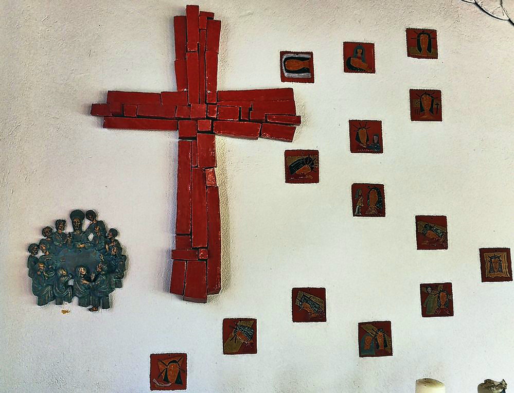 Buntglasfensters, des Altarkreuzes und der außen am Geländer angebrachten