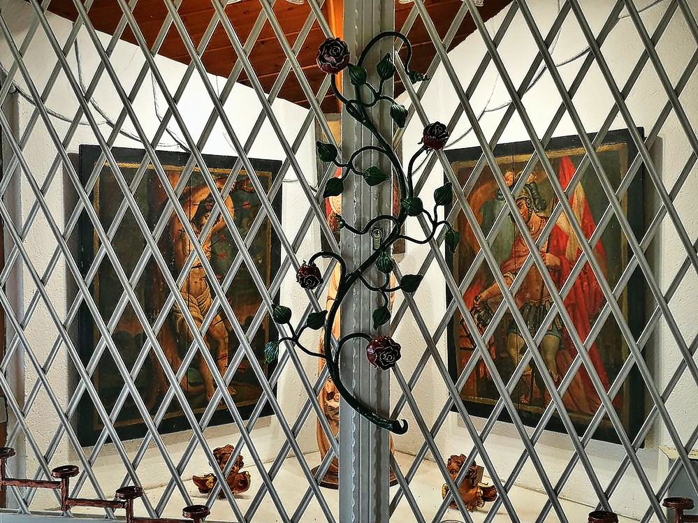 Hinter dem kunstvoll geschmiedeten Gitter des Seitenaltars