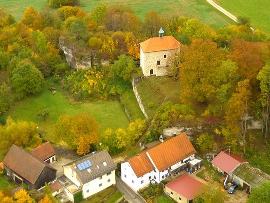 der Burg zu erkennnen. "Auf dem Gipfel des 612 m über Meereshöhe aufragenden Breitenstein stehen weithin sichtbar die beiden Felsen der ehemaligen Burgen Vorder- und Hinterbreitenstein. Von ihren Bauten verblieben nur wenige Reste. Sehr gut erhalten ist lediglich die Torkapelle (Anm.: rechts) auf Hinterbreitenstein bzw. Neubreitenstein. Sie besteht aus einem länglichen Baukörper aus gut geschichtetem Quadermauerwerk mit breit gerundetem Abschluss nach Osten. Das Erdgeschoss wird von einer tonnengewölbten Passage gequert, deren rundbogiges Außenportal mit seinen Pfeilern und Kapitellen sehr aufwendig gearbeitet ist." (3)