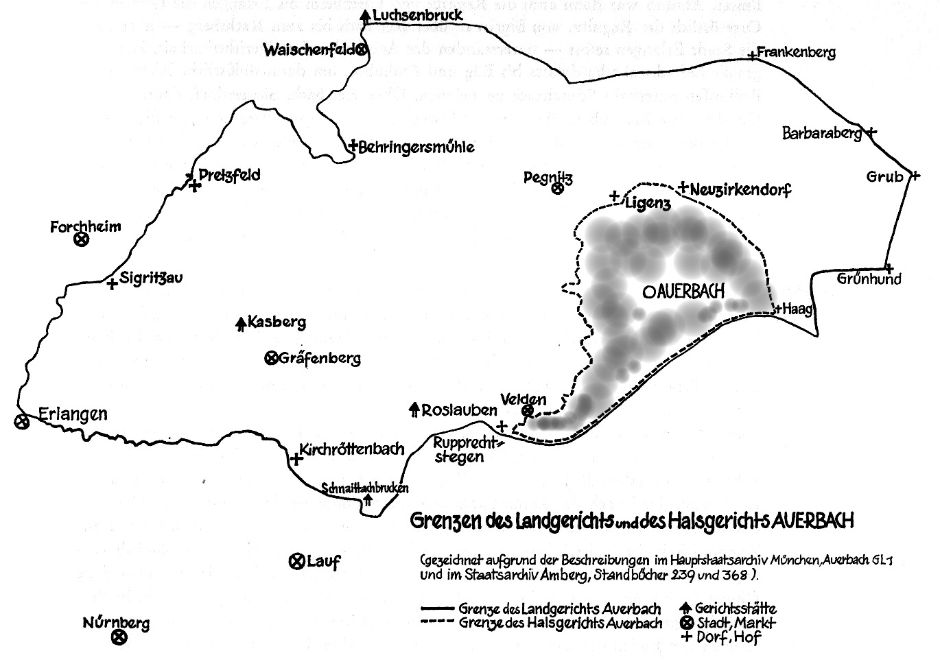 Auf obiger Karte ist der Halsgerichtsbezirk Auerbach besonders markiert. (Sage) (nach Schnelbögl, Fritz, Auerbach in der Oberpfalz, 1976, Seite 124) Über mir leihweise zur