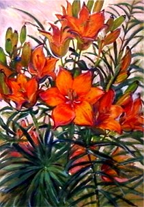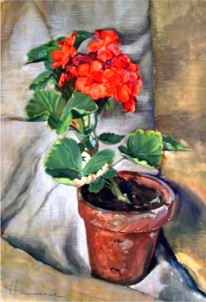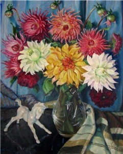 Ludwig Haimerl malte eine Reihe von Blumenbildern in verschiedenen Techniken, z.B. Feuerlilien und Geranien (beides Aquarelle) und Dahlien (Ölbild; Mitte). (aus 2)