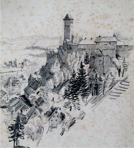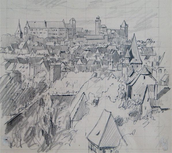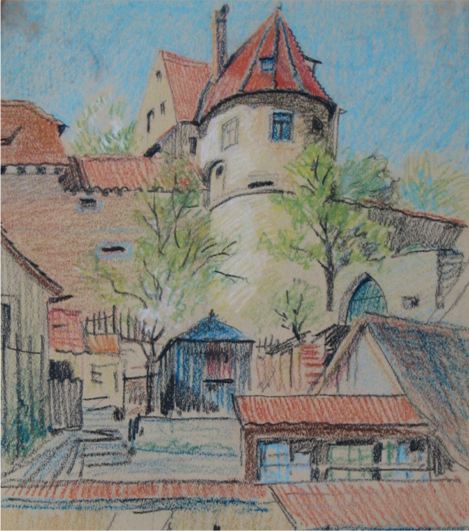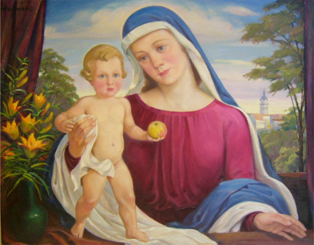 in Nürnberg. (aus 2) In dieser Zeit entstand eine ganze Reihe von Bildern, die einen direkten Bezug zu Auerbach zeigen. So auch dieses Madonnenbild mit dem Kirchturm von Auerbach rechts im Hintergrund.