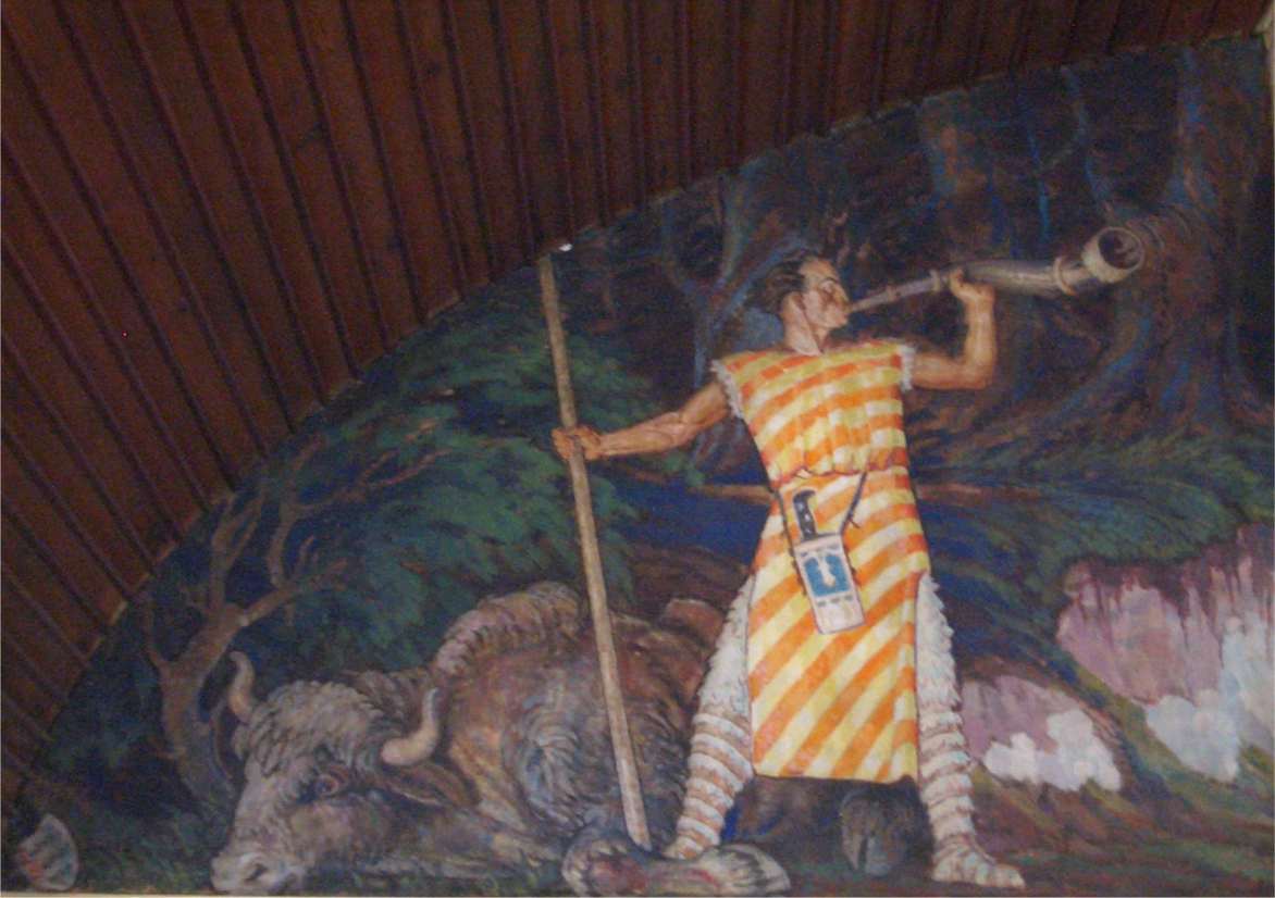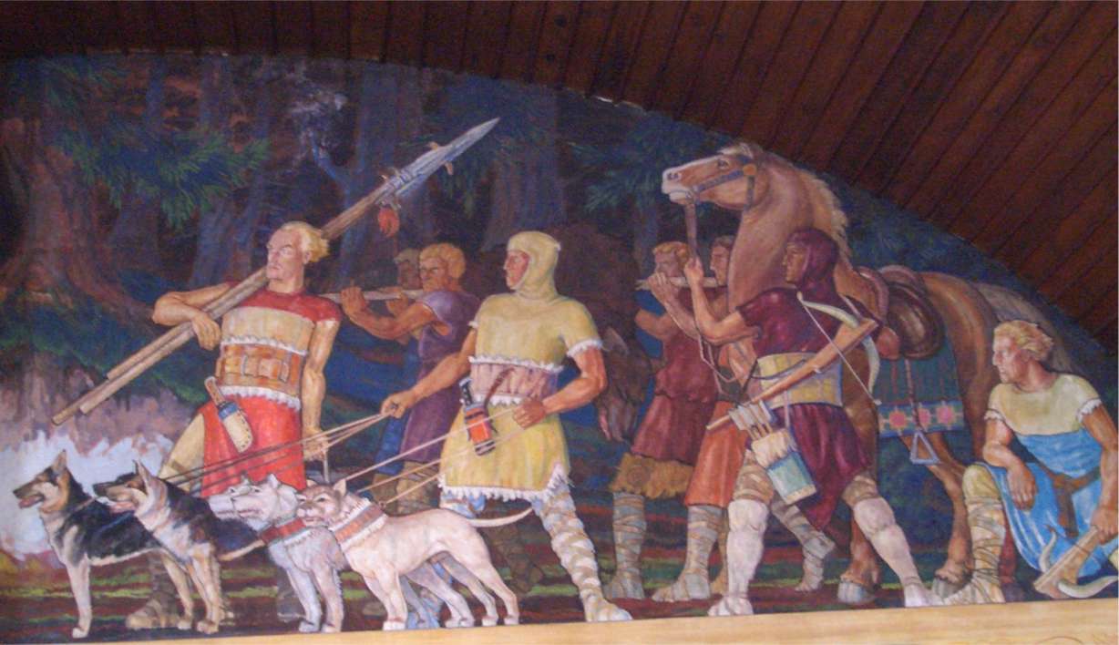 Hier für die Szene "Einzug von Kaiser Karl IV. in die Stadt Auerbach" an der Stirnseite des Sitzungssaales und für das große rückwärtige Wandgemälde "Jagd auf den Ur" standen Auerbacher dem Autodidakten Haimerl Modell. (z.B. war der stolze Jäger vor dem erlegten Auerochsen unten links Georg Eiles)