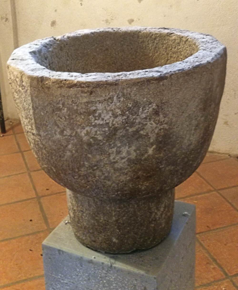auf einem Sockel ein ganz alter Taufstein. Er soll noch aus
