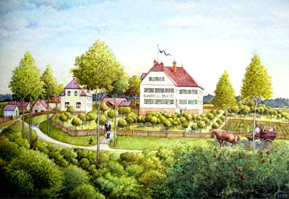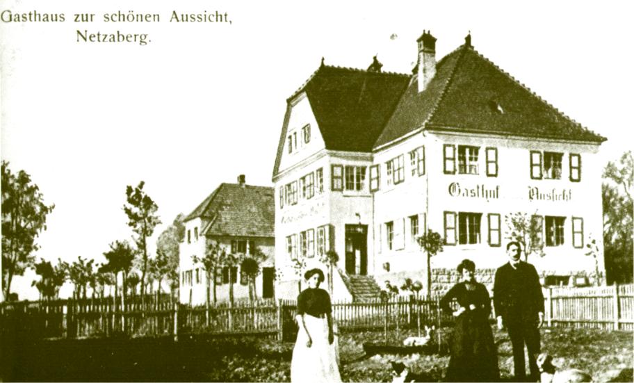 nordwestlich der Stadt Grafenwöhr. (Luftbild) Darauf ist auch zu sehen, dass die Ortschaft nur aus wenigen Anwesen bestand, nämlich damals aus genau vier Stück. Am aufallendsten war zweifelsohne der erst 1909, also ein Jahr nach der Errichtung des Truppenübungsplatzes, entstandene "Gasthof zur schönen Aussicht". Erbauer und erster Betreiber des beliebten Wirtshauses war der 1876 in Netzaberg geborene Franz Fichtl. Zuletzt hatte Netzaberg damit fünf Häuser. Der Gasthof zur schönen Aussicht trug seinen Namen völlig zu Recht, denn "von hier aus konnte man fast den gesamten alten Platz übersehen und die Scharfschießen der königlich Bayerischen Fußartillerie mitverfolgen. Die Schießübungen lösten seinerzeit bei der Bevölkerung rund um den Platz großes Interesse aus und wurden sogar als Werbemittel zum Anlocken von Besuchern benutzt". (2, Seite 250) Rechts im Bild (aus 3) Franz Fichtl, der Erbauer des Gasthauses in Netzaberg. Helmut Fichtl (3), dessen Vorfahren aus Netzaberg stammen, ließ dieses Bild vor einigen Jahren von Frieder Schneider nach einer alten Ansichtskarte malen. Es zeigt sehr anschaulich von einer anderen Seite her auch das Umfeld vom Gasthof zur schönen Aussicht in Netzaberg. Das Wirtshaus wurde um 1948 angebrochen. Netzaberg,