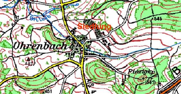 aus liegen der alte Ortskern links im Tal und die Siedlung rechts. (siehe auch