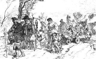 Gruppen von Invaliden mit ihren Familien von Ort zu Ort, aber