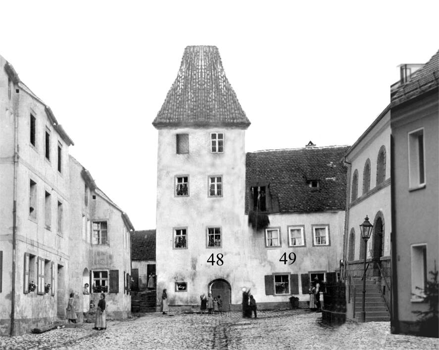 Als 1418 das neue, heutige Rathaus gebaut wurde, verlegte man die beiden Wohnungen ins Haus Nummer 49 und die Gefängnisse in 48. Auf dieser Fotomontage (aus 2, Seite 153) ist der frühere Prediger- oder Bürgerturm eingebaut. Im Erdgeschoß war nun bis 1608 das Gefängnis. 1796 verkaufte die Stadt diesen ehemals doch recht stattlichen Mauerturm, den 1877 der "Sauschuster" Lehner, Eigentümer auch von Nr. 49, teilweise abtragen ließ. Erst 1999 wurde er ganz abgerissen. Zur Verbindung der Pfarrstraße mit der oberen Vorstadt ließ die Stadt 1950 das Haus Nr. 49 (zusammen mit 24 und 50) abbrechen. Daran arbeite ich gerade. Bitte etwas Geduld. verwendete Quellen