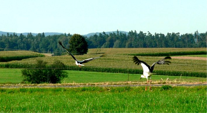 Christa Schleicher, von der diese Fotos stammen (Danke!), hatte beim sonntäglichen Spaziergang ihren Fotoapparat dabei und lichtete Familie Adebar zunächst bei der Brotzeit und dann auch beim Flugtraining ab.
