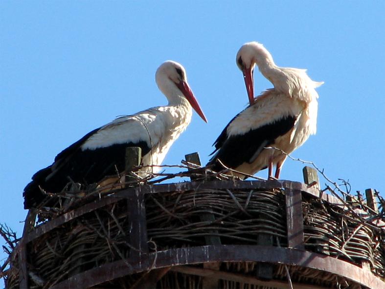 Störche wieder auf ihrem angestammten Platz auf dem Weiß-Kamin zu finden.