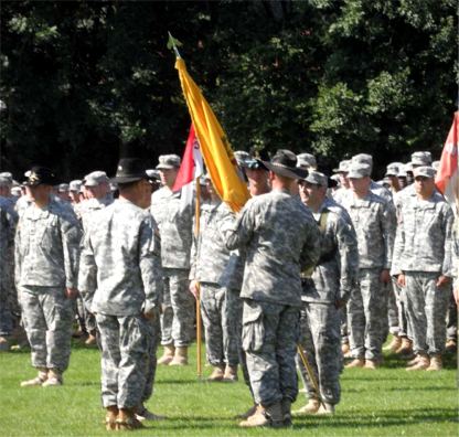 Truppenfahne der Stryker. Links das Fahrzeug, auf dem der scheidende
