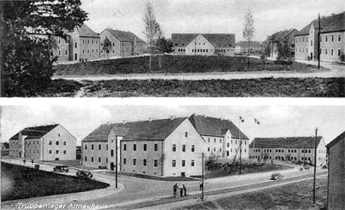 ausgewiesen." (7, Seite 135) Der Bau des eigentlichen Truppenlagers begann dann am 1.Juli 1937. "Es wurde so angelegt, dass sich im westlichen Teil die Truppenunterkünfte, Stallungen und Unterstell- und Wartungshallen für die Artillerie befanden, während im östlichen Teil die Gebäude für die Unterbringung eines Infanterieregiments mit Waffen und Gerät errichtete wurden." (7, Seite 135) "Im Juni 1938 war das Lager für die obenangeführten Truppenstärken auch bezugsfertig." (6, Seite I/166f) Am 11. Juni 1938 zogen dann die ersten Truppen ein. "Die Fertigstellung des letzten Bauabschnitts verzögerte sich jedoch bis zum Jahr 1941." (7, Seite 135) Schuld daran waren sicher, wie beim Westlager Bernreuth, die Materialknappheit und der Ausbruch des 2. Weltkriegs am 1. September 1939. Eines der Stallgebäude der bespannten Artillerie wurde bald zur Südlagerkapelle umgebaut und umfunktioniert. Die Turmhaube stammte von der Kapelle des Hammergutes Altneuhaus, die Glocke von der aus Altenweiher. (7, Seite 137)