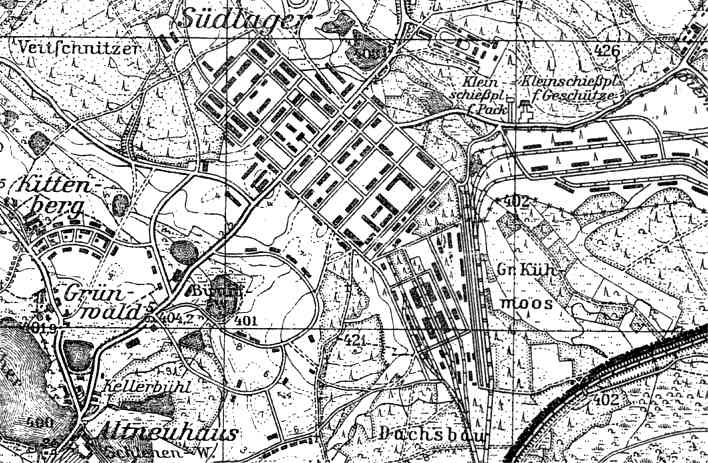 Das Südlager "Mit dem Bau des Südlagers (Lager Vilseck) wurde das mit Erlaß des Oberkommandos des Heeres vom 24.12.1936 ... gegründete Heeresbauamt Bayreuth, welches unweit des Gutshofes Altneuhaus in einer Baracke eine Neubauleitung errichtete, beauftragt. ... Das neue Lager am Südrand des erweiterten Truppenübungsplatzes sollte Unterkünfte für ein Infanterie-Regiment und zwei Art. Abteilungen bekommen, die auch gebaut worden sind. Unterkunftsstärke: 160 Offiziere, 4.045 Uffz. und Mannschaften sowie 1.125 Pferde."(6, I 166) "Als Bauplatz