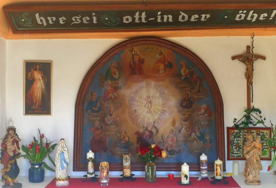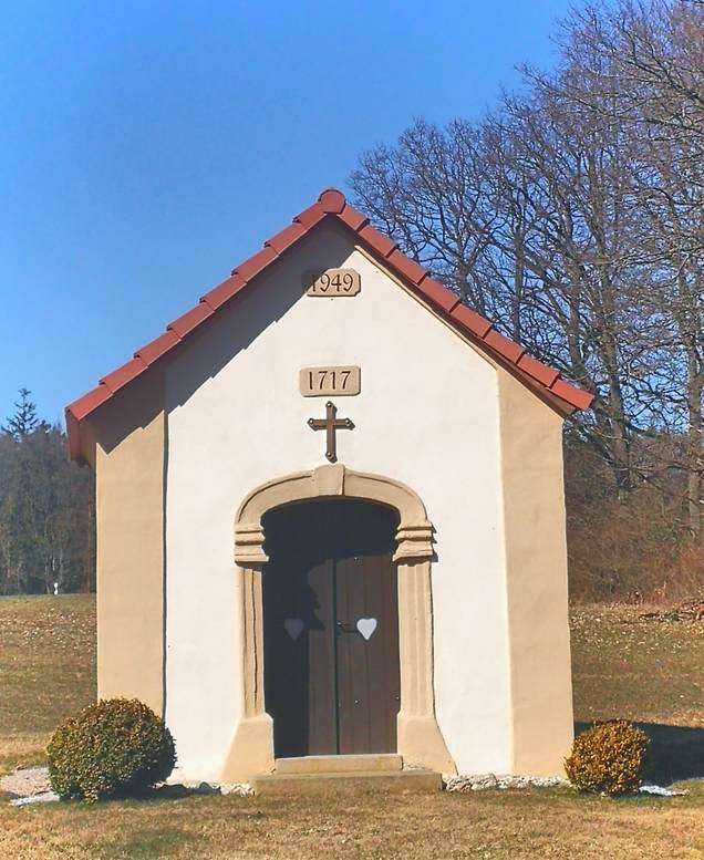 Die kleine Kapelle zu den 14 Nothelfern wurde 1717 errichtet und kurz nach Kriegsende1949 gründlich saniert, wie in Stein gehauene Inschriften über dem Eingang zeigen.