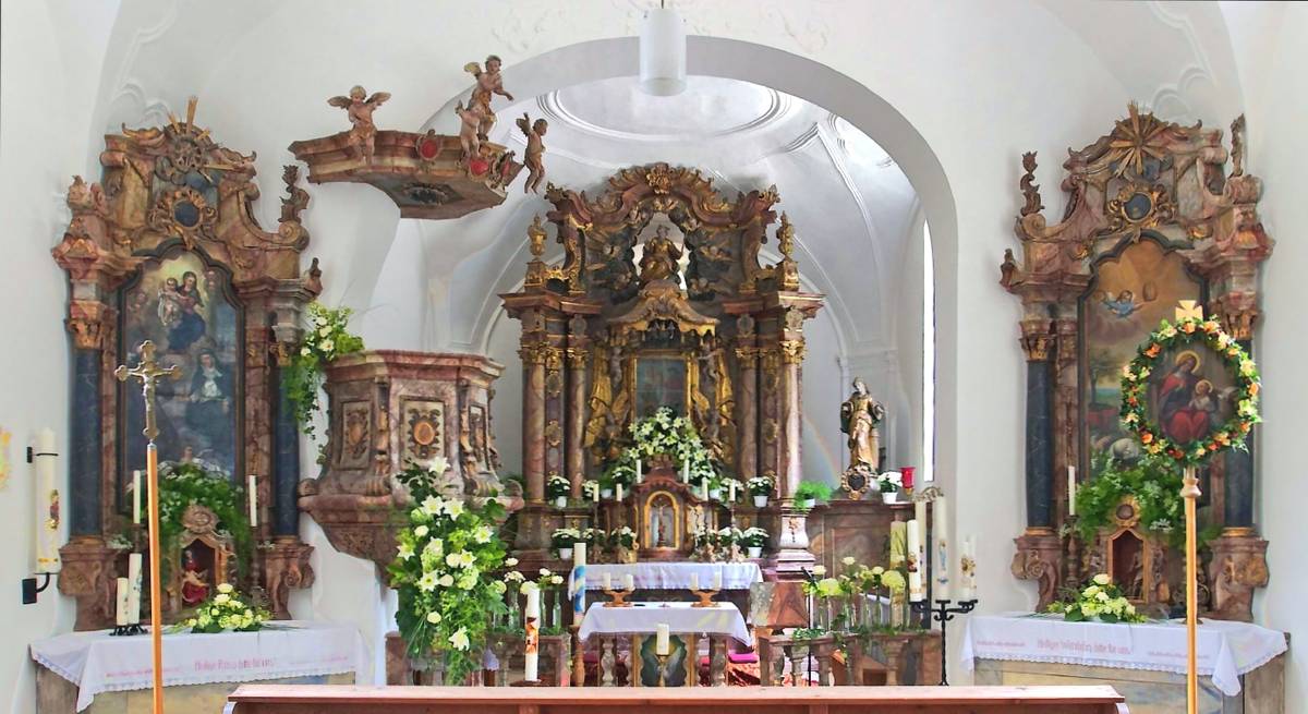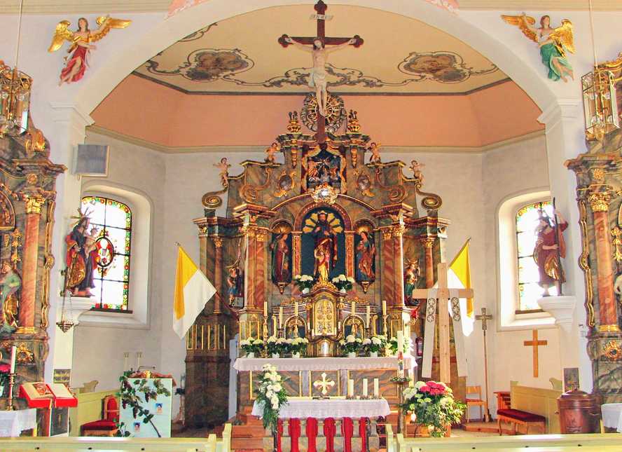 Das Kirchlein macht auch im Inneren einen gut gepflegten Eindruck. Das Altarbild zeigt ein Gemälde der 14 Nothelfer. Uns schickt der Himmel Unter diesem Motto führte die katholische Jugend von