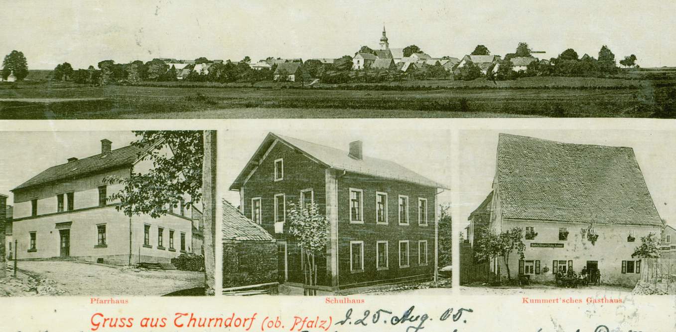 (Luftbild Laumer) Diese alte Ansichtskarte (Detail) zeigt Thurndorf um 1900 mit einigen markanten Gebäuden. Die Burg der Herrn von Thurndorf ... stand gleich neben der Kirche und dem Friedhof. In