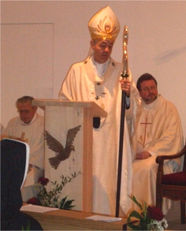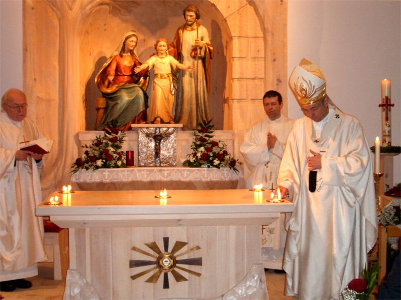 "Die Reliquienbestattung ist die Fortsetzung der Allerheiligenlitanei und weist noch einmal deutlich darauf hin, dass wir immer, wenn wir zum Altar kommen, mit allen Heiligen verbunden werden. Beim Hören des Wortes Gottes, bei der Darbringung der Opfergabe, bei allem Beten und Singen, bei der heiligen Kommunion und beim `Gehet hin in Frieden` sind wir umgeben von der ´Wolke der Zeugen`, wie es im Hebräerbrief heißt, die uns selbst zu Heiligen machen wollen." (1) "Das Verbrennen des Weihrauchs bedeutet: Wer sich am Altar mit Christus verbindet, soll zu einer wohlriechenden Gabe für Gott werden, wie der Weihrauch. ... Dann wird der Altar bereitet und es werden die Kerzen angezündet. Sie wollen darauf hinweisen, dass wir Lichter Christi sein sollen, die in der Finsternis der Welt leuchten, damit alle die Liebe Christi begreifen und die Menschenfreundlichkeit Gottes spüren ... ´Ihr seid das Licht der Welt ... das auf den Leuchter gestellt werden muss, damit es allen im Haus leuchtet´." (1) Erzbischof Schick feierte dann in Konzelebration mit den anwesenden Geistlichen erstmals das Messopfer auf dem Altar. Altartisch, Ambo und Aufbau für die