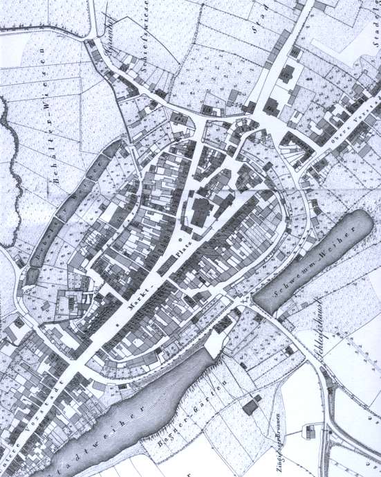 Stadtweiher - Schwemmweiher - Behälterweiher Ein Blick auf einen alten Grundrissplan von Auerbach zeigt, dass der Stadtkern auf beiden Längsseiten praktisch von Weihern umgeben war. Diese dienten u. a. der Versorgung mit Brauchwasser, lieferten Trinkwasser, besonders für die Tiere, und stellten Löschwasser bei einem Brand. Die Weiher waren aber auch ein wichtiger Teil der mittelalterlichen Befestigungsanlage der Stadt. Hierzu sei bemerkt, dass der Stadtgraben außerhalb der beiden Mauerringe nur im Bereich des Schlosses mit Wasser gefüllt war. Auf dieser Skizze (nach 1, Band XVI, Seite 28f) ist auch der Speckbach eingezeichnet, der der "Bachgasse" ihren Namen gab und 1964 im Zuge der Kanalisation der Innenstadt zugefüllt wurde. Der Stadtweiher Er war ursprünglich viel größer als heute, wie auf dieser Aufnahme um 1950 zu sehen ist. Der in obiger Planskizze eingezeichnete Teil wurde Ende der fünfziger Jahre zugeschüttet und ist heute Parkanlage, sowie Spiel- und Bolzplatz an der Weiherstraße. Der